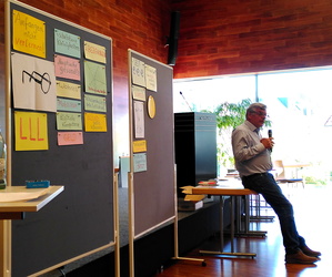 Der Referent motivierte die Teilnehmenden mittels Wortkarten mit Aussagen zum Alter/n zu Gesprächen und zum Austausch in den Tischgruppen. In lockerer Art ging Bernhard Kraus durch das Publikum und entlockte dabei so manchen Kommentar zu den Zitaten.